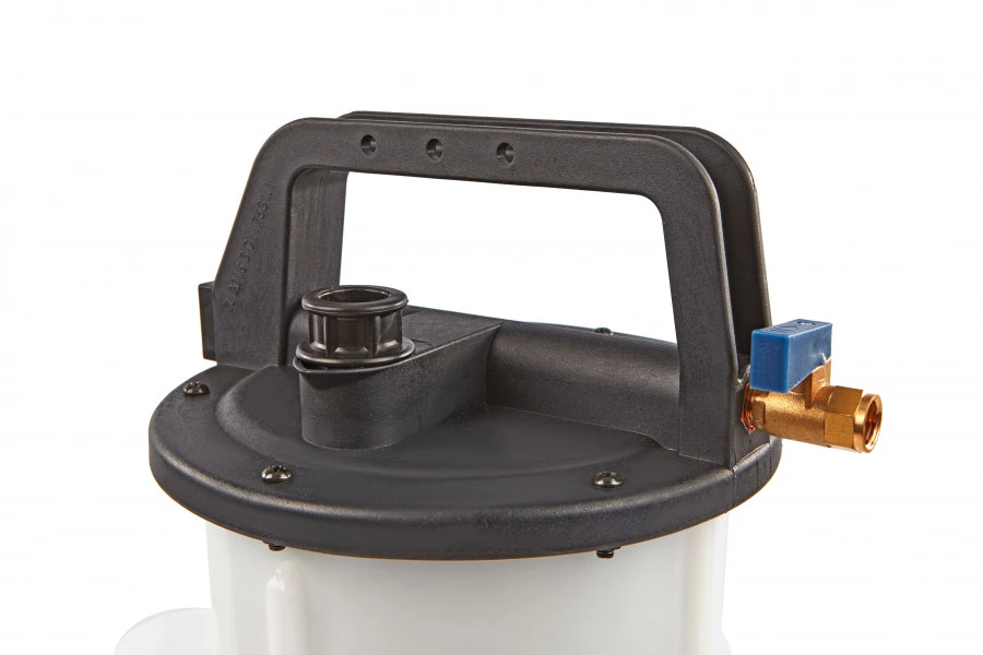 Bovenaan de pomp zit een kunststof handvat, waarmee je het geheel snel en veilig meeneemt. De kleine opening en nozzle aan de bovenkant dient vervolgens als opname voor een slang of leiding waardoor je efficiënt vloeistof toevoert. Ook hevel je de bijgevulde vloeistof ook veilig over door middel van de metalen nozzle aan de zijkant.