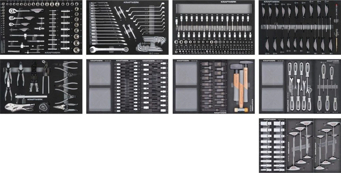 Een goede gereedschapswagen is onontbeerlijk voor klussers. Met deze Kraftwerk haal je een 180 centimeter brede wagen in huis die van alle gemakken en gereedschappen is voorzien. Zo kun je beide ladenblokken afzonderlijk afsluiten en is de wagen voorzien van valbescherming doordat maximaal één lade per keer geopend kan worden. Aan beide zijkanten kun je extra gereedschap kwijt aan de perfowanden. En zelf wordt de gereedschapswagen geleverd met diverse doppen, tangen en nog veel meer.