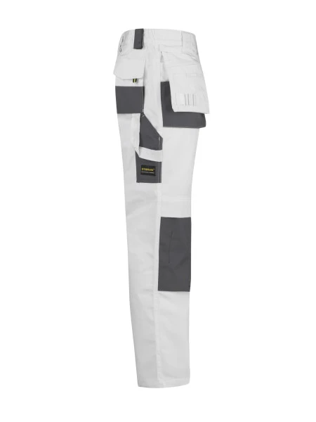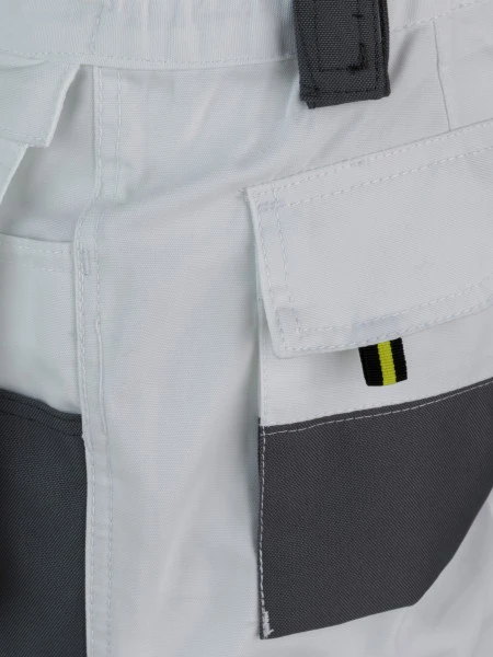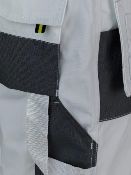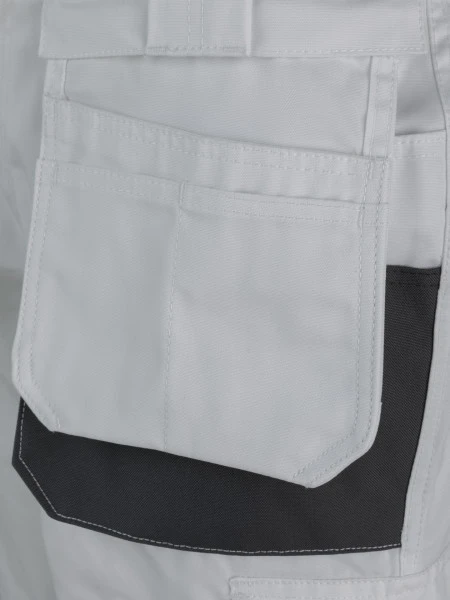 De broek heeft ook verschillende zakken, namelijk twee open en twee met klittenband afsluitbare heupzakken, twee klittenband kontzakken en een duimstokzak. En op beide knieën zitten verstevigde kniezakken voor kniekussens en de broek heeft ook twee afritsbare workerzakken met open zakken en pennenzakken- en houders