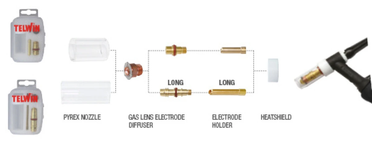 Een opbouw van de accessoires is te zien op afbeelding 2 (let op deze Clear Cup Box is de lange variant die als onderste wordt getoond). De voordelen van het gebruik van deze Crystal Clear Cup Box is dat u een beter zicht heeft op het smeltbad waardoor u met hogere precisie kunt lassen. Verder is het resultaat een mooiere las omdat omdat de gasdoorvoer constanter en gerichter verloopt. En uw verbruiksartikelen/ consumables gaan langer mee vanwege een verlaagde kans op vervorming. En dit laatste zorgt dan weer voor lagere kosten.