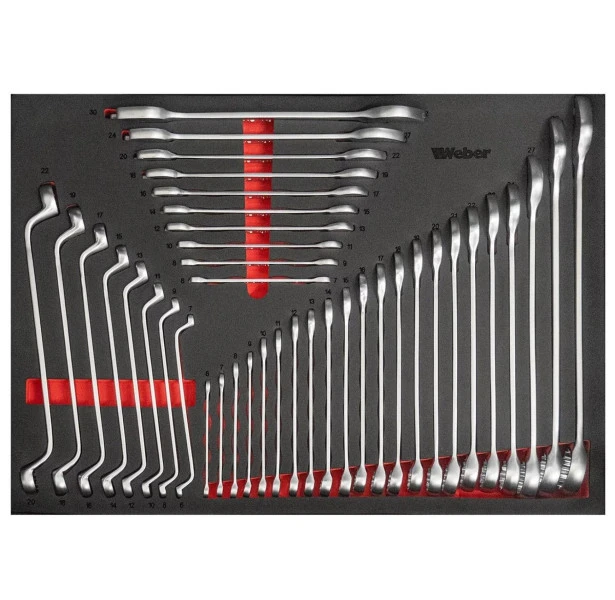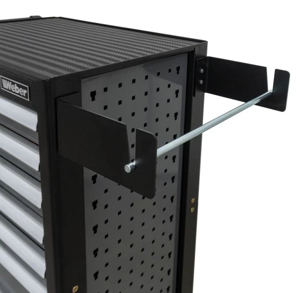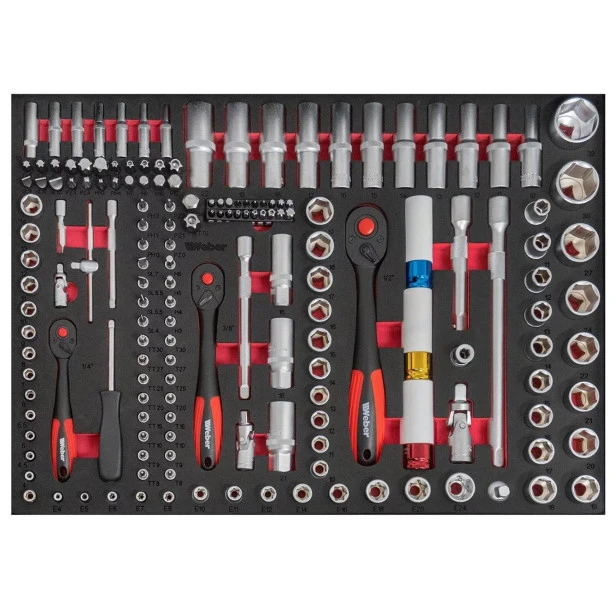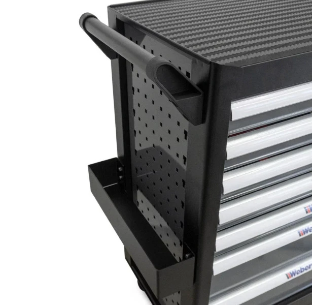 Weber staat bekend om hoge kwaliteit gereedschap en machines en daar vormt deze gevulde gereedschapswagen geen uitzondering op. Deze stevige wagen wordt geleverd met 300-delig gereedschap bestaande uit meerdere bits, tangen, hamers, doppen, sleutels en nog veel meer in diverse maten en uitvoeringen. De gereedschapswagen zelf is voorzien van twee zwenkwielen met rem en bevat een papierrol- en spuitbushouder. Aan de zijkanten kun je gereedschap ophangen aan de perfowanden. Er kan slechts één lade tegelijkertijd geopend worden, waarmee omvallen wordt voorkomen. Daarnaast is de buitenzijde voorzien van een kras- en stootvaste poedercoating, zodat de wagen lang mooi blijft en tegen een stootje kan.